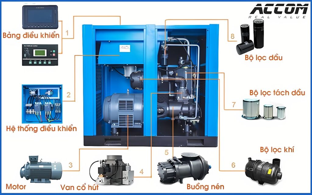 Máy nén khí trục vít có dầu được cấu thành từ nhiều bộ phận chính, mỗi bộ phận đều có vai trò quan trọng trong quá trình nén khí. Dưới đây là các bộ phận chính của máy: