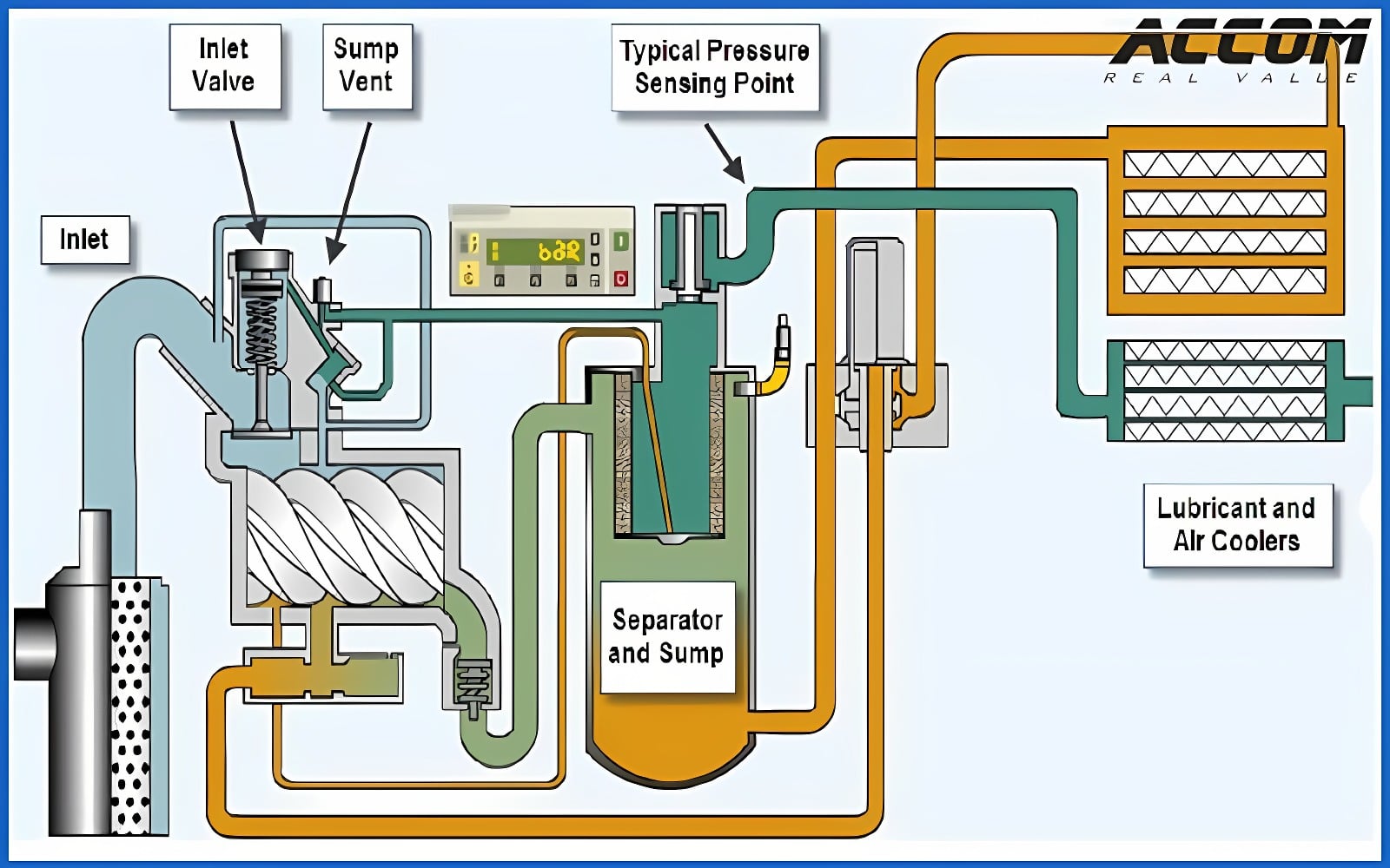 - Hệ thống bôi trơn: Dầu được phun vào buồng nén để bôi trơn, làm mát và làm kín khe hở giữa hai trục vít. Hệ thống này bao gồm bơm dầu, bộ lọc dầu và hệ thống làm mát dầu.